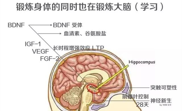 同時過往生物老師都告訴我們神經不能再生,事實上在 1998 年科學家已經發布論文,發現神經是可以再生的,通過運動產生 BDNF(腦源性神經營養因子)最終不僅促進海馬區的突觸可塑性,加強記憶;同時可以促進促進神經新生,再由前額葉控制在 28 天后經過分化成為新的神經細胞。