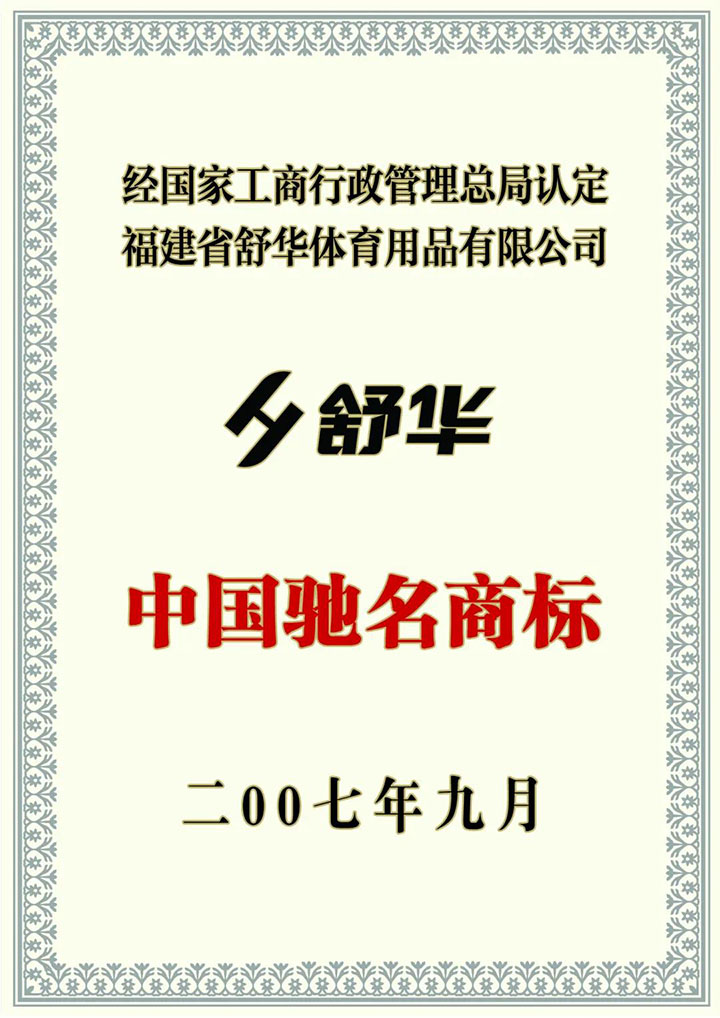 “舒華SHUA”品牌被國家工商總局認定為“中國馳名商標”。