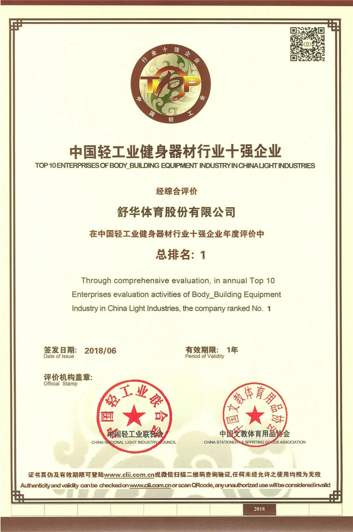 公司連續四年榮獲中國輕工業聯合會及中國文教體育用品協會頒發的“中國輕工業健身器材行業十強企業”稱號。